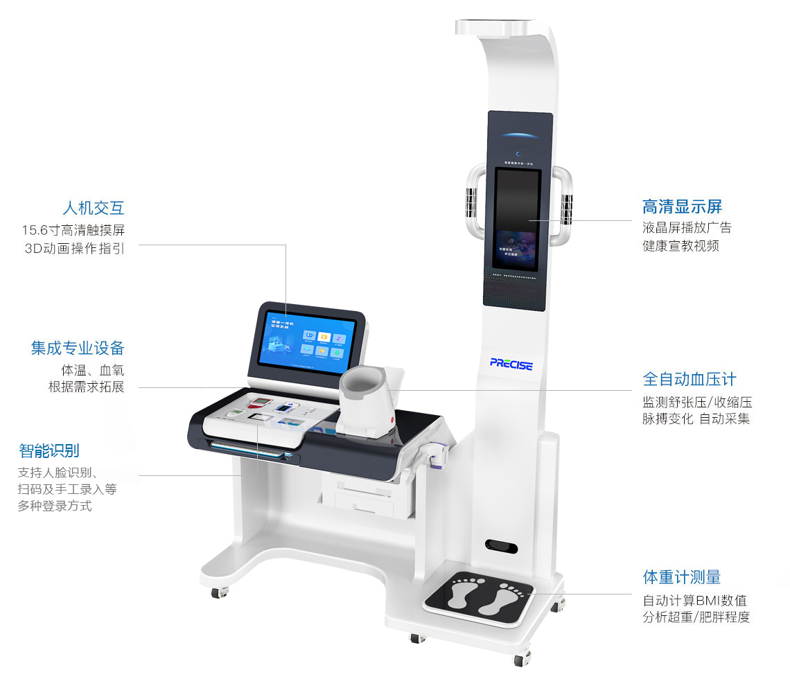 涵盖基本公卫体检项目,触摸屏操作、嵌入盖式工作台。八种登录方式(身份证,扫码,人脸识别,游客登录,手工录入,手机号,ID卡,扫条码)