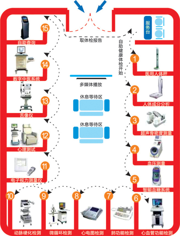 自助式健康小屋主要配备心电图、人体脂肪、血压、身高体重、骨密度、血糖、肺功能及心血管功能八个检测项目。全部完成后会打印报告单,同时还有健康知识的宣教。