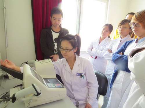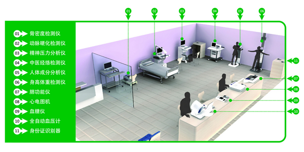 广西健康小屋配备的仪器设备有身高体重测量仪、血糖仪、血压仪、骨密度仪、肺功能检测仪等,有专业的医师在旁指导提供帮助。社区居民可自行选择各种医疗设备、免费